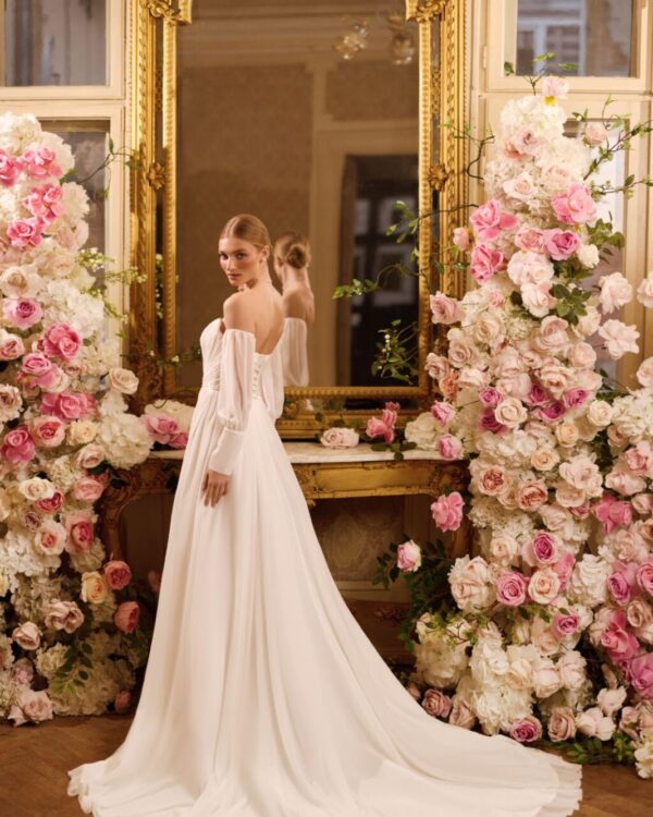 Το νυφικό φόρεμα διαθέτει εντυπωσιακά φουσκωτά μανίκια, κορσέ με ντραπέ λεπτομέρειες και αέρινη φούστα με διακριτική ουρά που χαρίζει μοναδική κίνηση. Το απαλό λευκό ύφασμα αγκαλιάζει απαλά τη σιλουέτα, προσφέροντας άνεση και αρμονία σε κάθε βήμα.