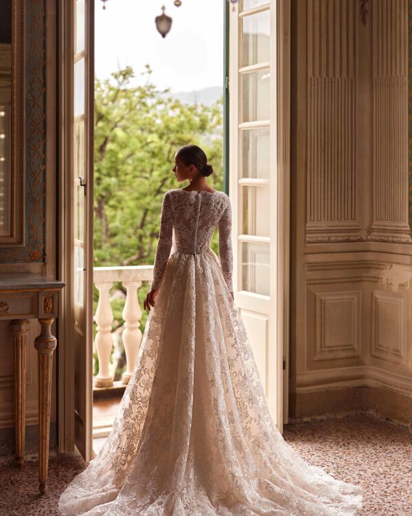 Ρομαντικό νυφικό όλο δαντέλα. Με μακριά μανίκια και ουρά.