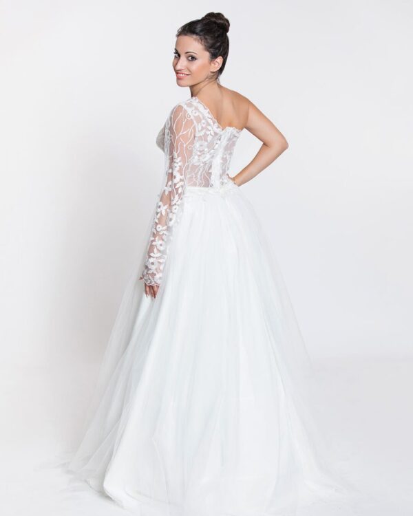 Ρομαντικό νυφικό σε Άλφα γραμμή, με φούστα από γαλλικό τούλι και κεντημένη δαντέλα κάτω από τη μέση. Με υπέροχο ολοκέντητο μπούστο με γαλλική δαντέλα που καταλήγει σε βαθύ V στην πλάτη και το μπούστο. Άνετη γραμμή. Ελληνικής ραφής