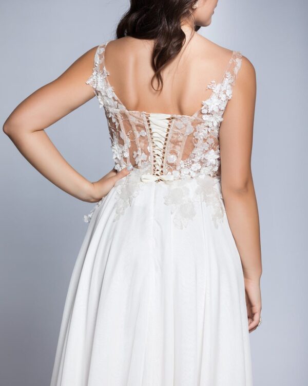 Ρομαντικό νυφικό σε Άλφα γραμμή με κεντημένο μπούστο από υπέροχη γαλλική δαντέλα και φούστα από πλούσιο γαλλικό τούλι. Μπούστο στράπλες όπου μπορούμε να προσαρμόσουμε τιραντάκι. Ελληνικής ραφής
