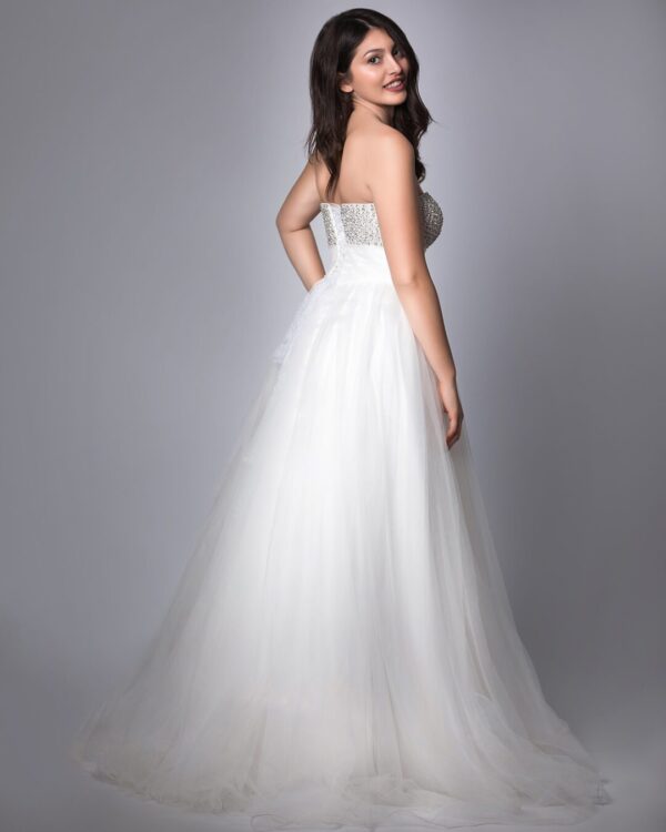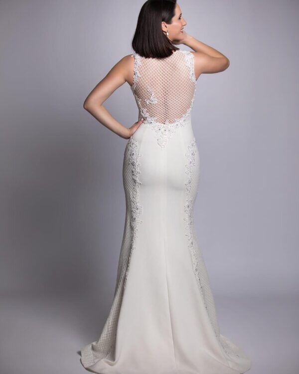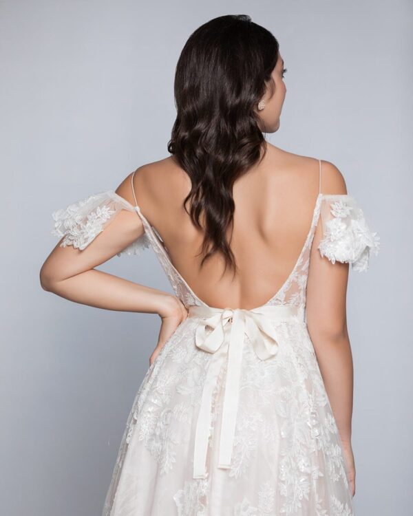 Ρομαντικό νυφικό σε Άλφα γραμμή με μπούστο κεντημένο με υπέροχη γαλλική δαντέλα και φούστα από γαλλικό τούλι, διακοσμημένη με δαντέλα κάτω από τη μέση. Μπούστο V, ραντάκι από δαντέλα και ανοιχτή πλάτη. Ελληνικής ραφής
