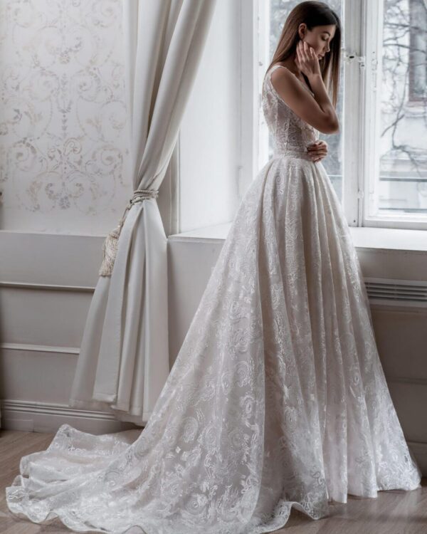 Ρομαντικό νυφικό σε άλφα γραμμή από γαλλικό τούλι απλικαρισμένο όλο με κεντημένη δαντέλα, μπούστο με V κεντημένο και άνοιγμα V στο πίσω μέρος της πλάτης. Πολλές νύφες μας, μας έχουν εμπιστευτεί και έχουν αγοράσει με τις συμβουλές μας το νυφικό τους online. Αν δεν είσαι σίγουρη για την εφαρμογή του μπορείς να κλείσεις ραντεβού για πρόβα στο [email protected] για να επισκεφτείς το φυσικό μας κατάστημα και κέρδισε 10% έκπτωση. Για οποιαδήποτε πληροφορία ή ραντεβού κάλεστε στο 22210 86623.