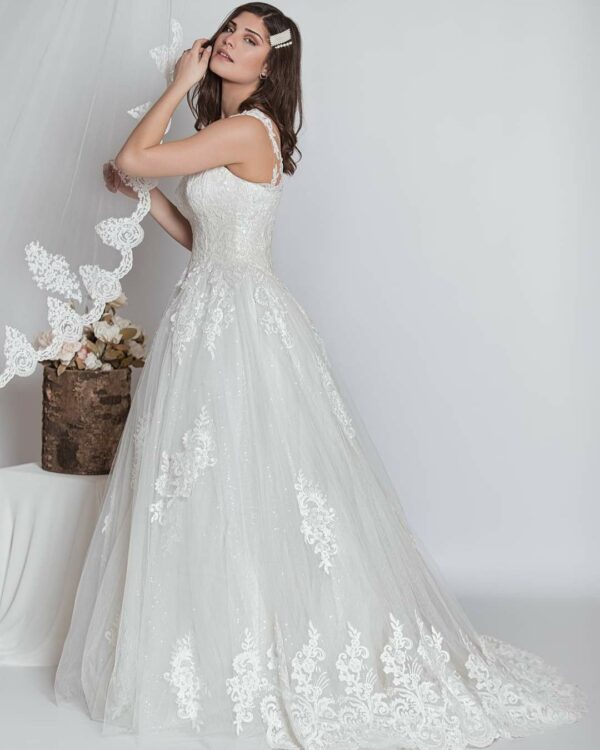 Ρομαντικό νυφικό σε Άλφα γραμμή, με φούστα από μεταξωτό τούλι και απλικαρισμένη γαλλική δαντέλα. Εντυπωσιακό δαντελένιο μπούστο στράπλες αλλά με διαφάνεια μέχρι τον ώμο που το κάνει σταθερό. Στην τιράντα έχει απλικαρισμένη γαλλική δαντέλα. Κανονική πλάτη όλο δαντέλα. Ελληνικής ραφής.