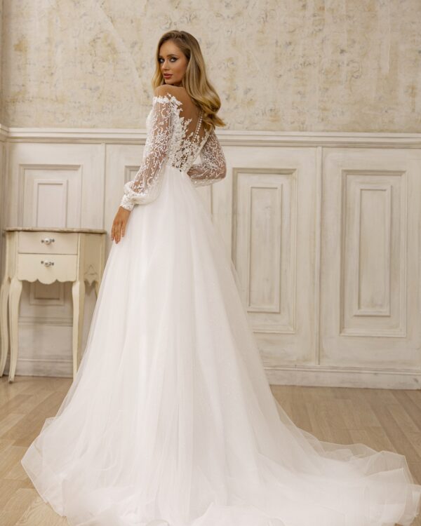 Ρομαντικό νυφικό στράπλες με μανίκια. Είναι στράπλες με διαφάνεια και έχει ανοιχτή πλάτη. Διαθέτει εντυπωσιακή ουρά