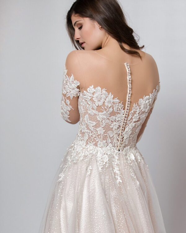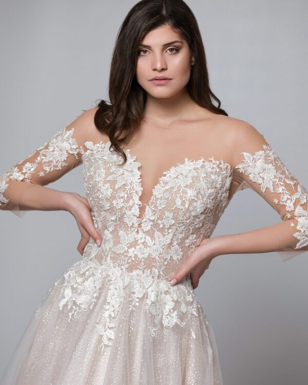 Ρομαντικό princess look νυφικό από γαλλικό τούλι στο χρώμα της πούδρας με effect glitter πουά. Εντυπωσιακή φούστα σε άλφα γραμμή, υπέροχο μπούστο ολοκέντητο με χάντρα , το τμήμα που αγκαλιάζει τους ώμους είναι φιλοτεχνημένο από λεπτομέρειες 3D γαλλικής δαντέλας. Αποτελείται από μεταξωτό solid τούλι το οποίο δίνει την αίσθηση του γυμνού αλλά στην ουσία δημιουργεί υπέροχο φινίρισμα στο δέρμα και τέλειο κράτημα στο στήθος. Κατασκευασμένο εξολοκλήρου στην Ελλάδα. Η τιμή αφορά στην αγορά ολοκαίνουργιου νυφικού.