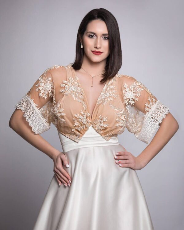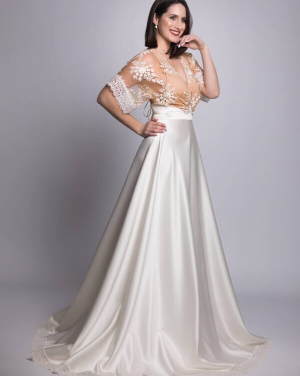 Ρομαντικό vintage νυφικό με εντυπωσιακή φούστα από κρεπ σατέν σε άλφα γραμμή με ενσωματομένο crop top από εντυπωσιακή ανάγλυφη vintage δαντέλα, με τελείωμα κιπούρ δαντέλα στα μανίκια, πολύ εντυπωσιακή ανοιχτή πλάτη και δέσιμο με κορδονάκια. Ένα εξαιρετικό νυφικό ευρωπαϊκής προέλευσης με απίστευτα υφάσματα και ραφές, ιδανικό για νύφες που αγαπούν το πάντρεμα του παλιού με το μοντέρνο στυλ. Πολλές νύφες μας μας έχουν εμπιστευτεί και έχουν αγοράσει με τις συμβουλές μας το νυφικό τους online. Αν δεν είσαι σίγουρη για την εφαργαγή του μπορείς να κλείσεις ραντεβού για πρόβα στο [email protected] για να επισκεφτείς το φυσικό μας κατάστημα και κέρδισε 10% έκπτωση.