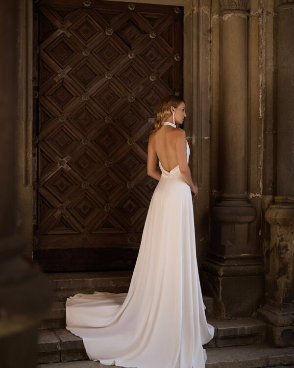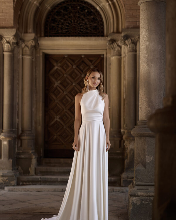 Το λείο ύφασμα αγκαλιάζει το σώμα απαλά, χαρίζοντας κίνηση, φινέτσα και λάμψη. Ιδανική επιλογή για τη νύφη που θέλει να εντυπωσιάσει με έναν elegant, minimal και ταυτόχρονα αριστοκρατικό χαρακτήρα