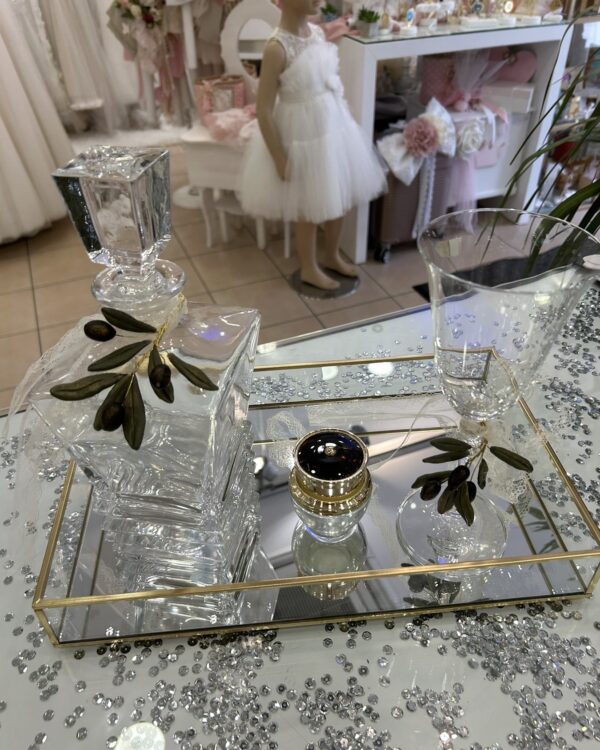 Σετ κουμπάρου από κρύσταλλο Βοημίας διακοσμημένο με χειροποίητη ελιά. Το σετ περιλαμβάνει περίτεχνο επίχρυσο δίσκο, ιδιαίτερη μποτίλια κρασιού και ένα ποτήρι από κρύσταλλο Βοημίας. Όλα είναι χειροποίητα και κατασκευασμένα στην Ελλάδα.