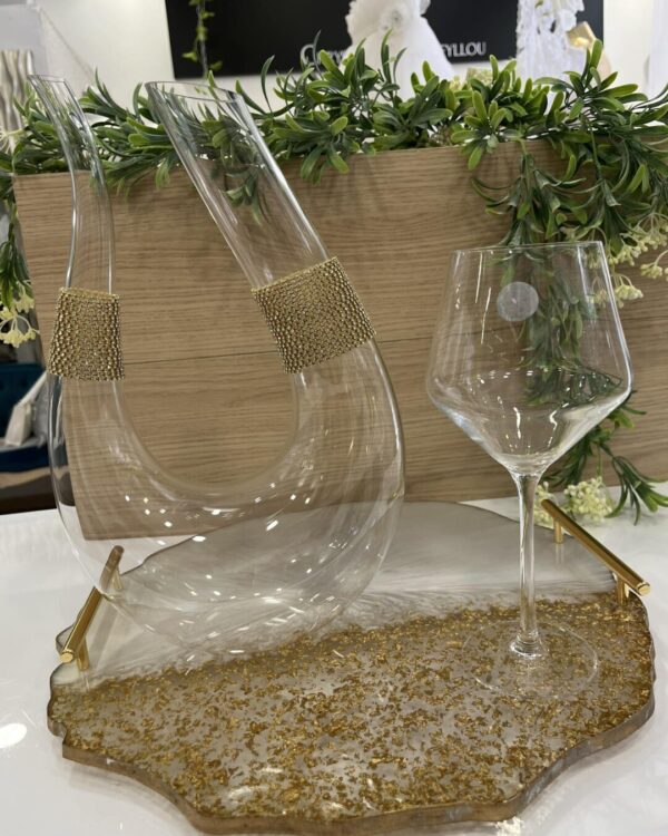 Σετ κουμπάρου από κρύσταλλο Βοημίας με υγρό γυαλί. Το σετ περιλαμβάνει περίτεχνο δίσκο απο υγρό γυαλί , ιδιαίτερη μποτίλια κρασιού και ένα ποτήρι από κρύσταλλο Βοημίας. Όλα είναι χειροποίητα και κατασκευασμένα στην Ελλάδα.