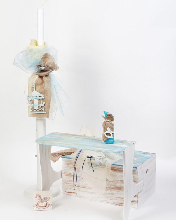 Σετ κουτί βάφτισης ξύλινο θρανίο με θέμα το καρουζέλ, ζωγραφισμένο στο χέρι σε αντικέ στυλ με χρώμα γαλάζιο και off white. Το σετ περιλαμβάνει στολισμό λαμπάδας (δεν συμπεριλαμβάνεται το κερί), 50 μαρτυρικά, 3 κεράκια, μπουκάλι λαδιού, σαπουνάκι, πετσέτες, σετ λαδόπανα και εσώρουχα. *Tο σετ βάπτισης είναι χειροποίητο και χρειάζεται 10-12 ημέρες παράδοσης.