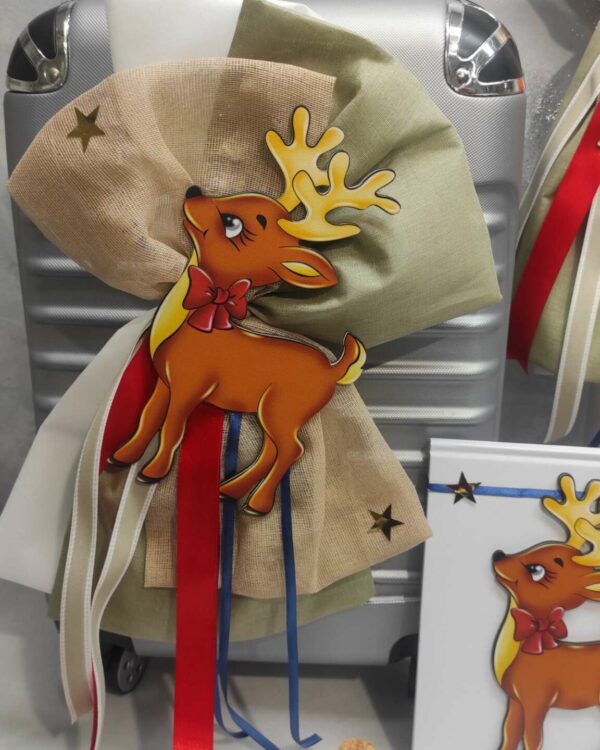 Πλήρες σετ βάπτισης ελαφάκι. Το σετ περιλαμβάνει στολισμένη τροχήλατη βαλίτσα ταξιδίου, στολισμό λαμπάδας (δεν συμπεριλαμβάνεται το κερί), βιβλιαράκι για ευχές και στολισμένο μπουκαλάκι λαδιού.