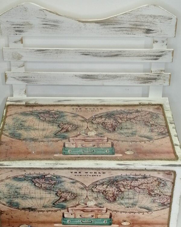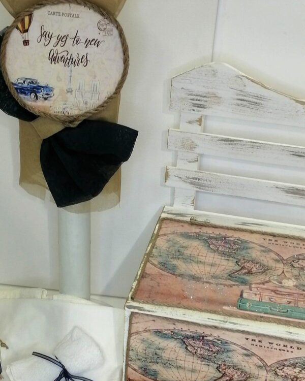 Σετ βάπτισης με κουτί και θέμα ταξίδια, συνδυασμένο με ρούχο και παπούτσι. Το σετ περιλαμβάνει το βαπτιστικό ρούχο σε γήινες αποχρώσεις (μέγεθος 18-24 μηνών), ανατομικό δερμάτινο παπουτσάκι σε navy blue νούμερο 21 (καλύπτει μέχρι 15 εκατοστά), καπέλο, παγκάκι με αποθηκευτικό χώρο, με ζωγραφισμένο τον παγκόσμιο χάρτη, με τεχνική decoupage, στολισμός λαμπάδας διακοσμημένος με στρογγυλό διάκοσμο με επιγραφή “Say yes to new adventures” (δεν συμπεριλαμβάνεται το κερί), 50 μαρτυρικά, 3 κεράκια, μπουκαλάκι λαδιού, σαπουνάκια, πετσέτες, σετ λαδόπανα και εσώρουχα. Το σετ κουτί βάφτισης είναι χειροποίητο και ζωγραφισμένο στο χέρι και χρειάζεται 10-12 μέρες παράδοσης.