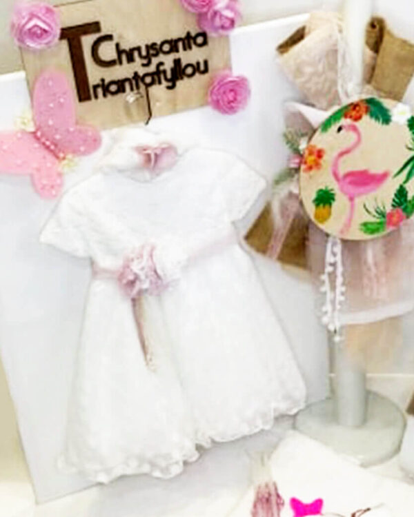 Σετ βάπτισης με άσπρη δερμάτινη βαλίτσα με διακόσμηση μπεζ λινάτσα και θέμα το Flamingo, συνδυασμένο με φόρεμα και παπουτσάκι. Το σετ περιλαμβάνει παπουτσάκι, φόρεμα, δερμάτινη βαλίτσα στολισμένη, στολισμό λαμπάδας (δεν συμπεριλαμβάνεται το κερί) με Flamingo ζωγραφισμένο στο χέρι, 50 μαρτυρικά, 3 κεράκια, μπουκαλάκι λαδιού, σαπουνάκια, πετσέτες, σετ λαδόπανα και εσώρουχα. Το σετ κουτί βάφτισης είναι χειροποίητο και ζωγραφισμένο στο χέρι και χρειάζεται 10-12 μέρες παράδοσης.