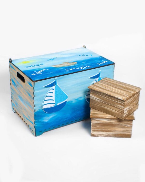 Σετ βάπτισης με Κουτί ξύλινο τετράγωνο σε χρώμα γαλάζιο/μπλε αντικέ, ζωγραφισμένο στο χέρι, με θέμα καραβάκι με ευχές. Το σετ περιλαμβάνει στολισμό λαμπάδας (δεν συμπεριλαμβάνεται το κερί), 50 μαρτυρικά, 3 κεράκια, μπουκάλι λαδιού, σαπουνάκι, πετσέτες, σετ λαδόπανα και εσώρουχα. *Tο σετ βάπτισης είναι χειροποίητο και χρειάζεται 10-12 ημέρες παράδοσης.