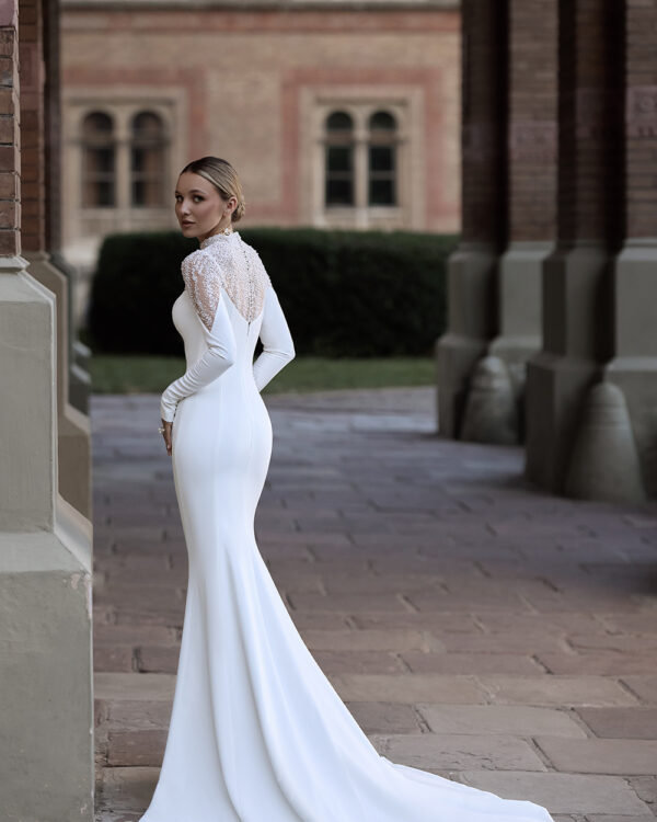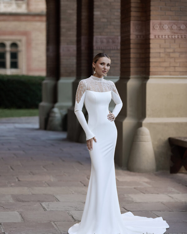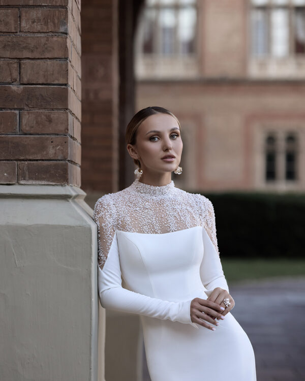 Σικ γοργονέ νυφικό με μανίκια. Ένα νυφικό που αποπνέει διαχρονική κομψότητα. Το γοργονέ νυφικό από κρεπ αγκαλιάζει αρμονικά τη σιλουέτα, αναδεικνύοντας τη θηλυκότητα με απόλυτη φινέτσα. Το μανίκι κεντημένο με πέρλες προσθέτει μία πινελιά πολυτέλειας και ρομαντισμού, ενώ η λιτή γραμμή του φορέματος δημιουργεί την τέλεια ισορροπία ανάμεσα στη μίνιμαλ αισθητική και την glamorous λάμψη.