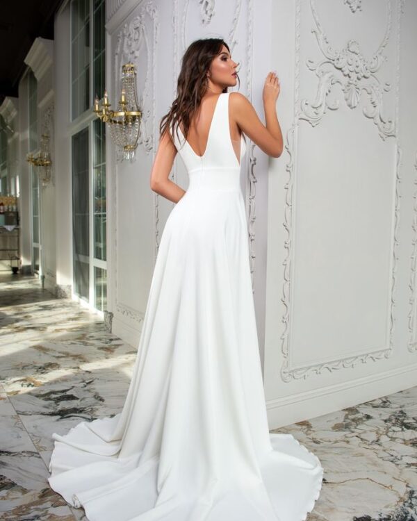 Σίκ νυφικό με διαφάνεια. Έχει βαθύ μπούστο V με διαφάνεια και ανοιχτή πλάτη.