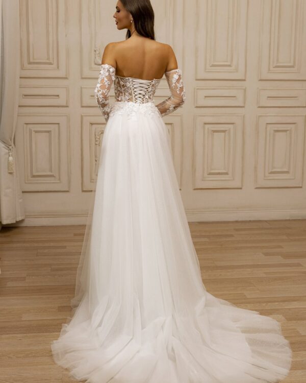 Στράπλες νυφικό με μανίκια και σκίσιμο. Στο πάνω μέρος είναι κορσές όλο δαντέλα που κολακεύει εκπληκτικά την μέση. Διαθέτει ουρά