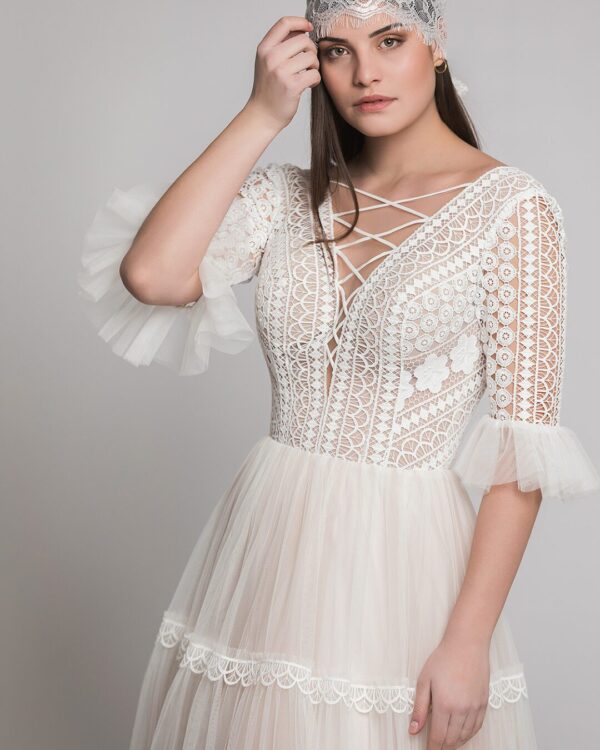 Το απόλυτο boho chic νυφικό για νύφες που θέλουν πραγματικά να εντυπωσιάσουν, φιλοτεχνημένο από μεταξωτό γαλλικό τούλι, κεντημένο με βαμβακερή κιπούρ δαντέλα, υπέροχο τρουακάρ ρομαντικό μανίκι, βαθύ V στο στήθος με αποτέλεσμα tattoo effect και λεπτομέρειες από χιαστή σατέν κορδέλα. Ανοιχτή εντυπωσιακή πλάτη με τελείωμα δαντέλας. Κατασκευασμένο εξολοκλήρου στην Ελλάδα. Η τιμή αφορά στην αγορά ολοκαίνουργιου νυφικού.