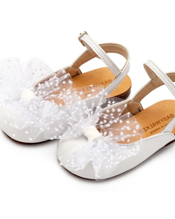Βαπτιστικά παπούτσια δερμάτινο γαλλικό σαμπό με χειροποίητο τούλινο φιόγκο, σε λευκό χρώμα.