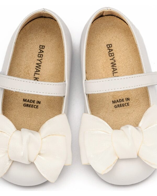 Βαπτιστικά παπούτσια Δερμάτινο γοβάκι μονή μπαρέτα “χρατς” με υφασμάτινο φιόγκο οργάντζας, σε λευκό χρώμα.
