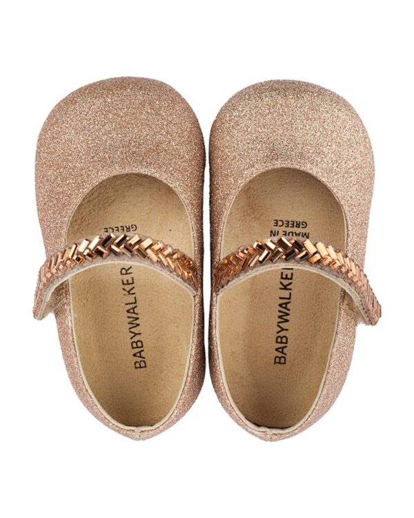 Βαπτιστικά παπούτσια γοβάκι με κρυστάλλινη μπαρέτα από μεταλιζέ ύφασμα σε χάλκινο χρώμα.