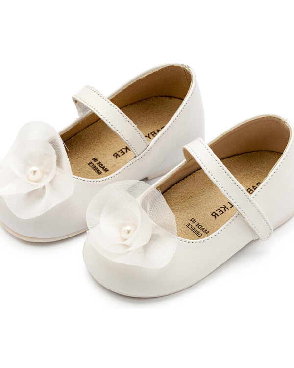 Βαπτιστικά παπούτσια με μονή μπαρέτα και χειροποίητο λουλούδι από οργάντζα και πέρλες σε λευκό χρώμα.