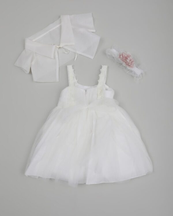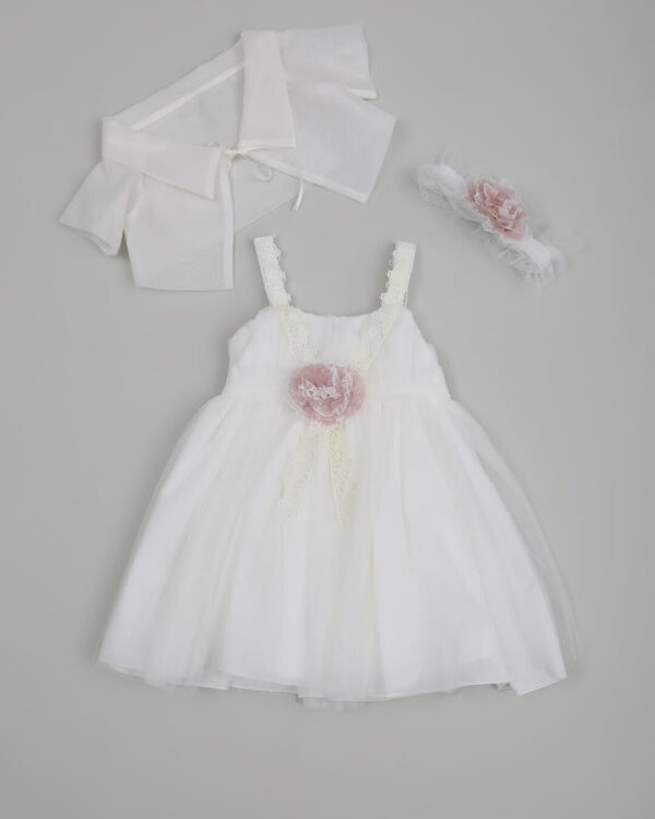 Βαπτιστικό φόρεμα Makis Tselios από γαλλικό τούλι και δαντέλα κεντημένη στη τιράντα, σε χρώμα off white και χειροποίητο λουλούδι στην μέση από γαλλικό τούλι και δαντέλα σε χρώμα σάπιο μήλο και off white. Ασορτί μπολερό και κορδέλα. Φοδραρισμένο με 100% βαμβακερό ύφασμα. Καλύπτει ηλικίες από 8 έως 24 μηνών.