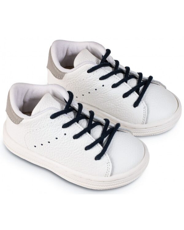 Χειροποίητο βαπτιστικό παπούτσι Babywalker με κορδόνια σε λευκό – γκρι χρώμα . Με δερμάτινο ανατομικό πάτο για ξεκούραστο περπάτημα, κατάλληλο για τα πρώτα βήματα του παιδιού. Ελληνικής ραφής