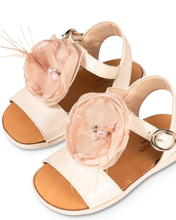 Βαπτιστικό παπούτσι πεδιλάκι σε εκρού – νουντ χρώμα. Διακοσμημένο με μεγάλο χειροποίητο λουλουδι οργάνζασ .