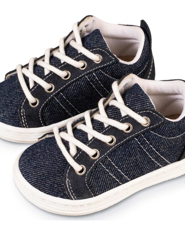 Χειροποίητο βαπτιστικό παπούτσι Babywalker με κορδόνια σε μπλε τζιν χρώμα . Με δερμάτινο ανατομικό πάτο για ξεκούραστο περπάτημα, κατάλληλο για τα πρώτα βήματα του παιδιού. Ελληνικής ραφής