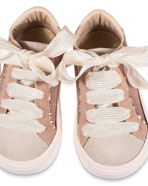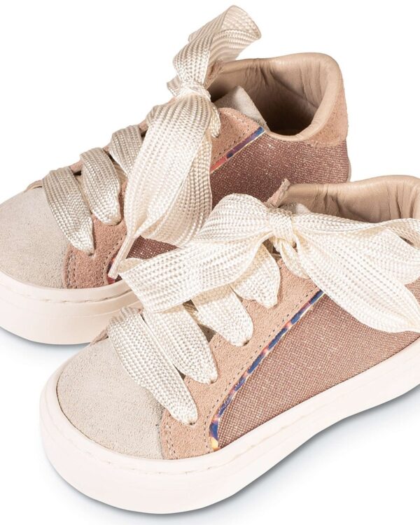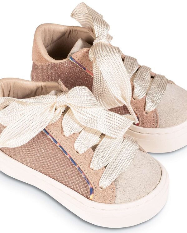 Βαπτιστικό παπούτσι Sneakers. Δετό από ύφασμα και δέρμα, σε ροζ αντικέ χρώμα.